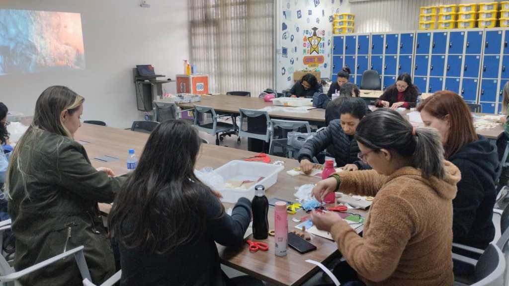 Durante a oficina, foram realizadas atividades práticas, como a criação de um painel sensorial e produções artísticas abstratas com diferentes texturas. Também ocorreram dinâmicas em grupo, uso de vídeos explicativos e propostas para a construção de ambientes escolares voltados ao estímulo da percepção sensorial dos estudantes.