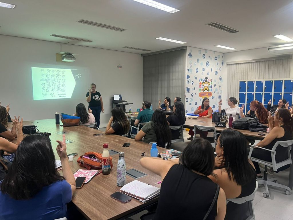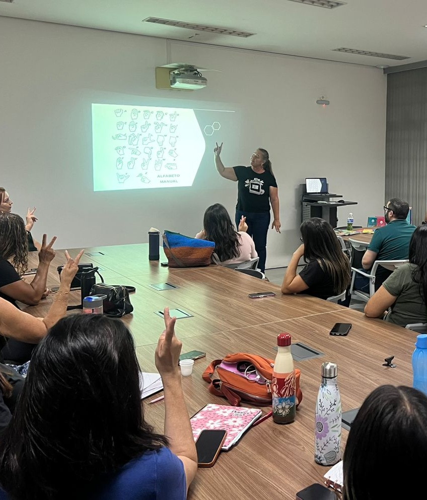 Na formação ocorrida no dia 26 de março nos períodos da tarde e noite, as Formadoras Carla Alves e Aline Moreno apresentaram aos professores inscritos noções básicas de Libras, vocabulário escolar essencial, alfabeto manual e estratégias de comunicação visual. Objetiva fortalecer a inclusão, promover acessibilidade e ampliar a segurança do professor na interação com o aluno surdo.